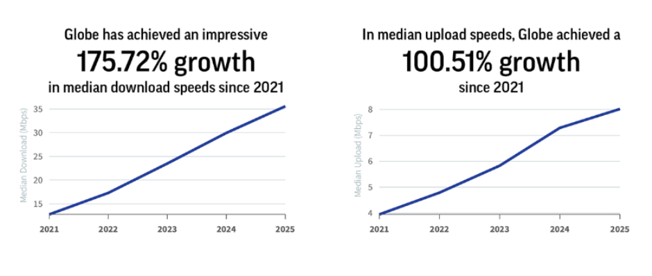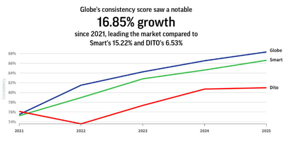 Speed and Consistency Gains: Since 2021, Globe has achieved +176 percent download speed, +101 percent upload speed, and a +16.85 percentage-point jump in Consistency Score.