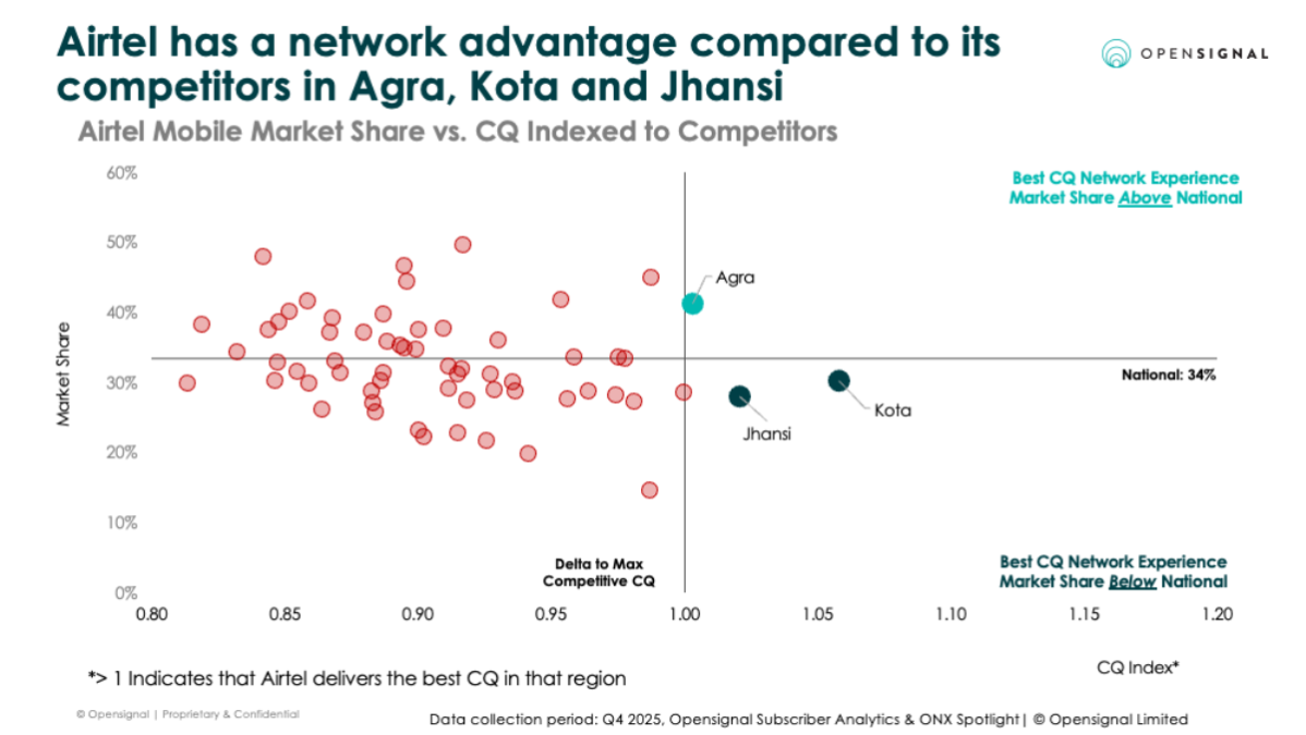 Bharti Airtel demonstrates a similar localized growth pattern. The operator has increased its national market share by around 1 percentage point since early 2024, with 73 percent of gains coming from Jio, indicating direct switching between premium users. Airtel’s success is particularly visible in cities such as Agra, Kota, and Jhansi, where strong network experience supports its premium offerings like Airtel Black converged plans. This growth is backed by sustained quarterly Capex exceeding ₹11,000 crore ($1.3 billion), enabling targeted network improvements in high-potential regions.
