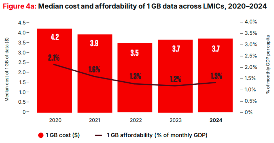 The GSMA Intelligence chart shows that the median cost of 1 GB of mobile data in low- and middle-income countries (LMICs) has gradually declined from $4.2 in 2020 to $3.7 in 2024, marking an overall improvement in affordability.