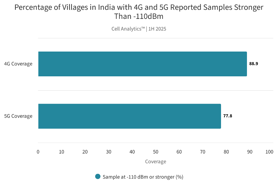 In the first half of 2025, 4G networks demonstrated widespread penetration in rural India. Data samples showed signal strengths stronger than -110 dBm in 88.9 percent of villages, underscoring the success of 4G as a foundational broadband technology.