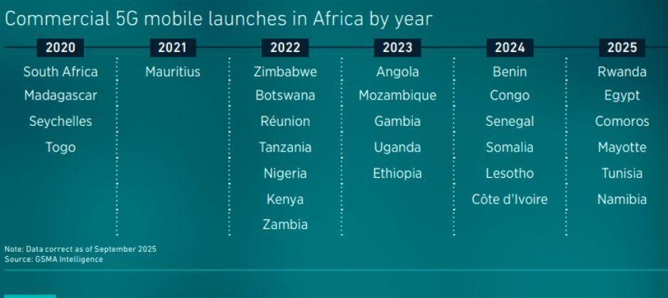 Since 2020, 5G has steadily expanded from early adopters like South Africa, Madagascar, and Togo to broader markets including Nigeria, Kenya, Zambia, Senegal, Côte d’Ivoire, Egypt, and Namibia by 2025. The rollout now spans nearly every region, reflecting stronger infrastructure investment and growing demand for high-speed connectivity.