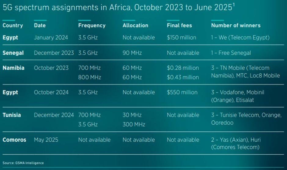 Between 2023 and 2025, several African countries accelerated 5G readiness through key spectrum assignments. Namibia, Senegal, Egypt, Tunisia, and Comoros all completed major allocations in the 700 MHz and 3.5 GHz bands, collectively enabling broader coverage and improved network capacity. Egypt alone raised $700 million through spectrum sales to Telecom Egypt, Vodafone, Mobinil (Orange), and Etisalat.