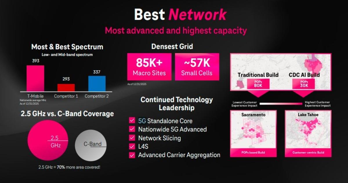 A core pillar of the strategy is spectrum leadership, with T-Mobile highlighting its strong holdings in low- and mid-band spectrum, particularly 2.5 GHz, which it claims delivers around 70 percent more coverage area compared to C-band deployments used by competitors. This spectrum advantage is designed to balance wide coverage with high capacity.