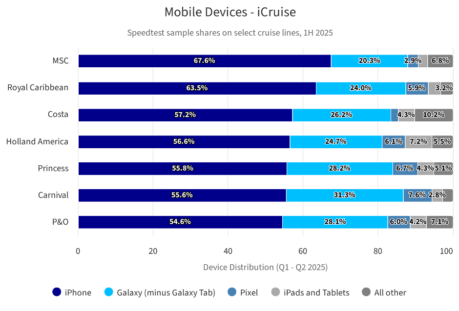A Speedtest analysis of cruise passengers’ devices in the first half of 2025 shows that over 60 percent use iPhones, compared to 25 percent using Samsung Galaxy smartphones. This aligns closely with the U.S. smartphone industry and reflects the relatively affluent, mass-market profile of cruise travelers.