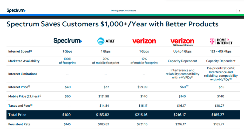 Spectrum is intensifying its value-focused positioning in Q3 2025, stating that U.S. households can save more than US$1,000 per year compared to AT&T, Verizon and T-Mobile, if they switch to Spectrum’s integrated broadband + mobile model.