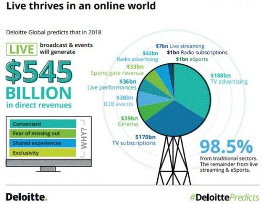 Live broadcast and events will generate over $545 billion in revenues in 2018. 50 percent of adults in developed countries will have at least two online-only media subscriptions, and by the end of 2020, the average will have doubled to four.