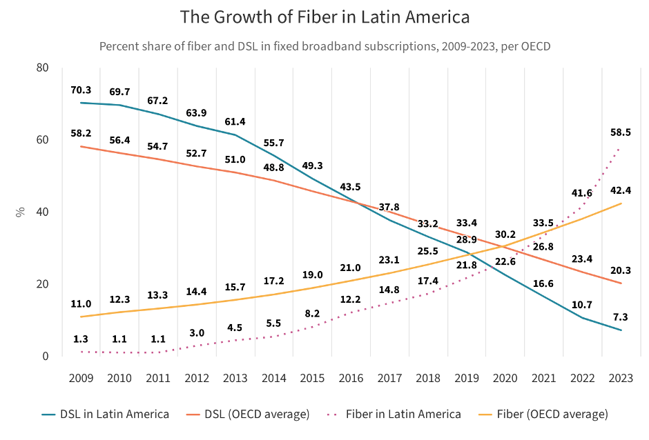 In Mexico, major international players such as Claro have driven the fiber transition, migrating 85 percent of their broadband customers to fiber, which has more than tripled median download speeds over five years.