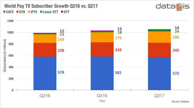 The Pay TV subscriber base globally reached 1.05 billion in the second quarter of 2017, according to the latest data published by Dataxis.