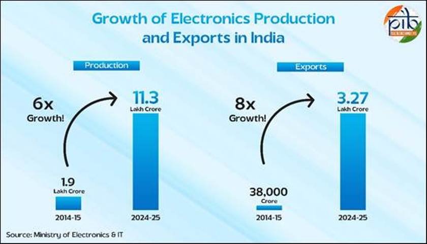 India’s electronics manufacturing has witnessed a six-fold rise over the past decade — from Rs 1.9 lakh crore in 2014–15 to Rs 11.3 lakh crore in 2024–25. Exports have grown eightfold to Rs 3.27 lakh crore during the same period, making electronics the third-largest and fastest-growing export category in 2024–25.