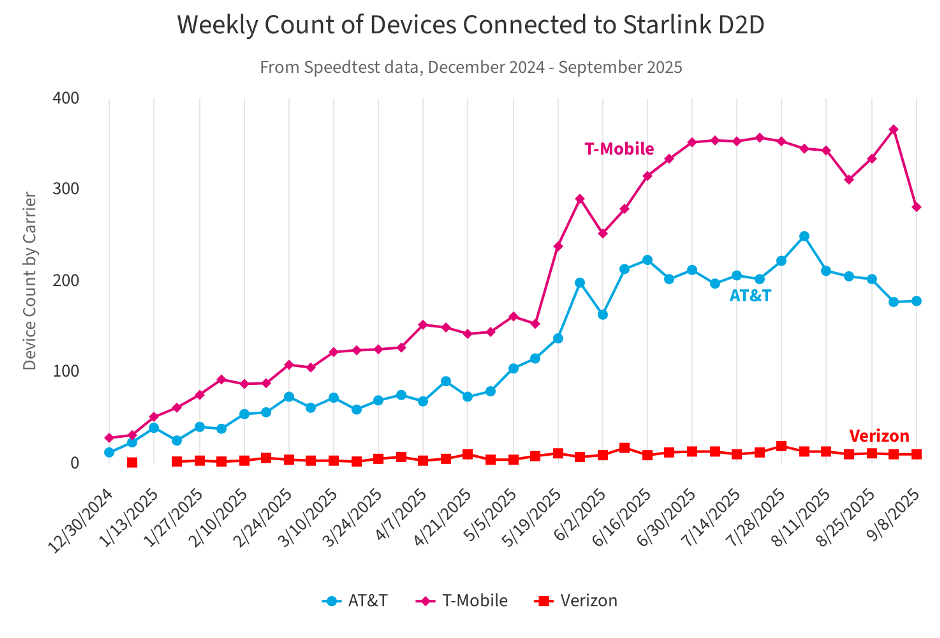 By September 2025, T-Mobile users remained the largest group on the service, with notable adoption among AT&T customers. Verizon adoption has been lower, likely due to its Skylo partnership, which offers satellite messaging primarily for emergencies but is expanding to regular use. AT&T has a deal with AST SpaceMobile, which aims to provide intermittent satellite connectivity later in 2025 and more continuous coverage in 2026 as its satellite constellation grows.