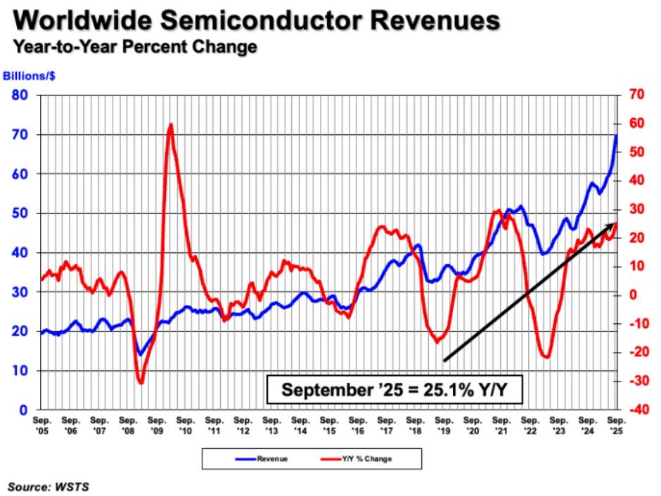 According to data compiled by the World Semiconductor Trade Statistics (WSTS) organization, global semiconductor sales totaled $69.5 billion in September 2025, a 25.1 percent increase compared to $55.5 billion in September 2024, and a 7 percent increase over August 2025. These figures are based on a three-month moving average and signal continued momentum in the global chip market.
