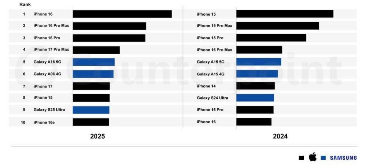 Apple’s iPhone 16 emerged as the world’s best-selling smartphone in 2025, according to Counterpoint Research’s Global Handset Model Sales Tracker. For the fourth consecutive year, Apple and Samsung dominated the Top 10 smartphone rankings, with the combined models accounting for 19 percent of total global smartphone sales.