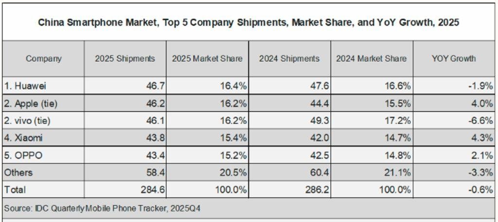 China’s smartphone market remained under pressure in 2025, with total shipments declining 0.6 percent year on year to 284.6 million units, according to IDC. Huawei led the market for the full year with shipments of 46.7 million units and a 16.4 percent market share, although its volumes slipped 1.9 percent compared with 2024.