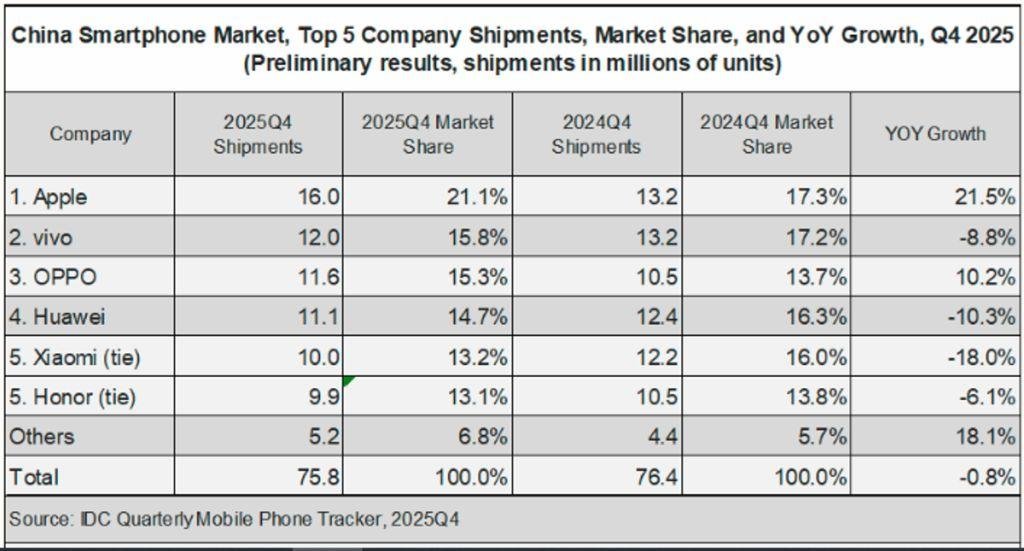 IDC preliminary data shows China’s smartphone market shipped 75.8 million units in the fourth quarter of 2025, marking a 0.8 percent year-on-year decline. Apple emerged as the clear market leader, shipping 16 million units and capturing a 21.1 percent market share. Apple also recorded the strongest growth among the top five vendors, with shipments rising 21.5 percent compared with Q4 2024, driven by strong demand for its latest iPhone models.