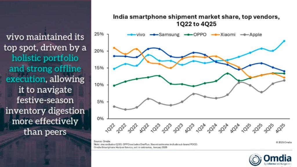 vivo retained its leadership position in the December quarter, shipping 7.9 million units and capturing a 23 percent market share. The brand also held the top spot for full-year 2025. Samsung followed with 4.9 million units and a 14 percent share, while OPPO excluding OnePlus overtook Xiaomi to secure third place with 4.6 million units and a 13 percent share. Xiaomi and Apple shipped 4.2 million and 3.9 million units, respectively.