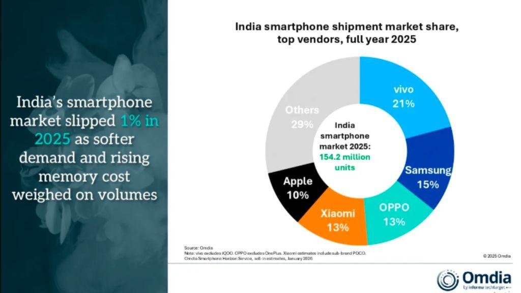 India’s smartphone shipments fell 7 percent year on year to 34.5 million units in the fourth quarter of 2025. For the full year, the market declined 1 percent to 154.2 million units. The Q4 slowdown reflected typical post-festive seasonality but was amplified by elevated channel inventories, currency pressure and weakened affordability in the mass market following price hikes linked to memory inflation.
