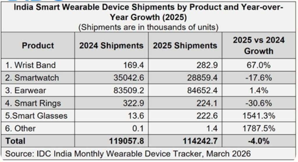 India’s wearable device market recorded its second consecutive annual decline in 2025, according to the latest India Monthly Wearable Device Tracker from International Data Corporation. Total shipments fell 4.0 percent year-over-year to 114.2 million units, impacted largely by a sharp contraction in smartwatch volumes.