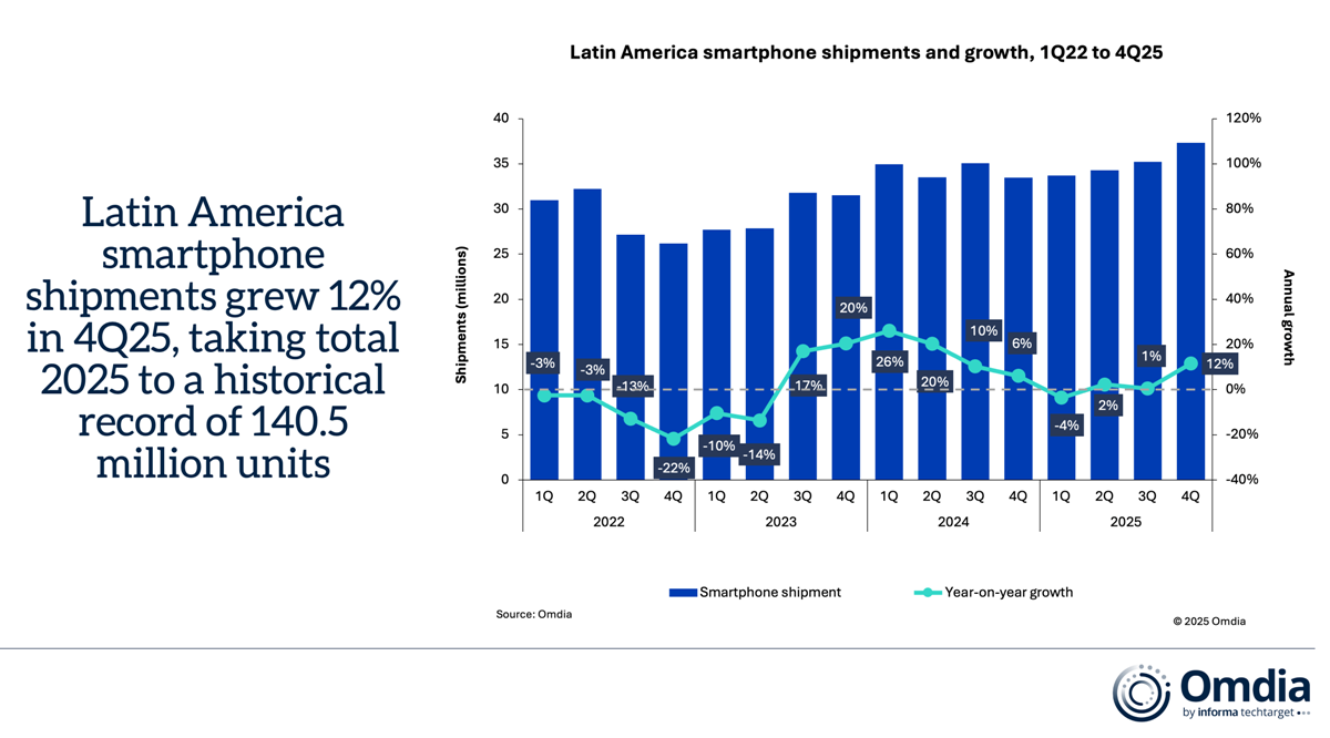 Latin America’s smartphone market has delivered strong momentum in 2025, with shipments rising 12 percent year over year in the fourth quarter and 3 percent for the full year, reaching a record 140.5 million units, according to new research from Omdia.