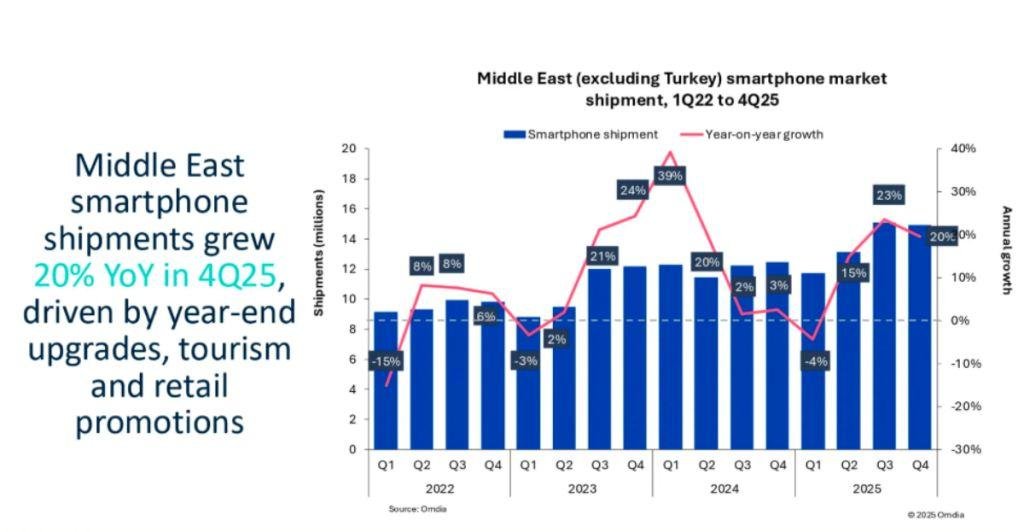 According to Omdia, smartphone shipments in the Middle East (excluding Turkey) reached 54.8 million units in 2025, rising 13 percent and marking the third consecutive year of double-digit expansion. The market closed the year strongly, with 4Q25 shipments increasing 20 percent to 14.9 million units.