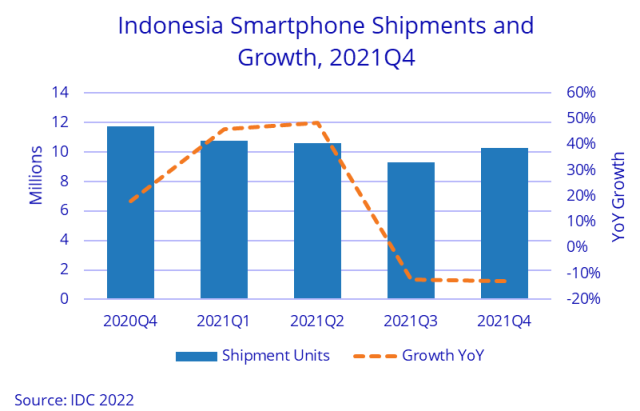 Smartphone market in Indonesia is forecast to grow by 8 percent to 44 million units in 2022, according to IDC report.