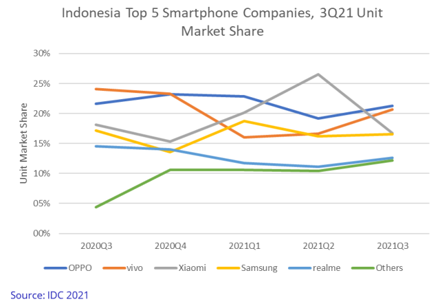 OPPO, Vivo, Xiaomi, Samsung and Realme are the leading suppliers of smartphones in Indonesia during the third quarter of 2021.