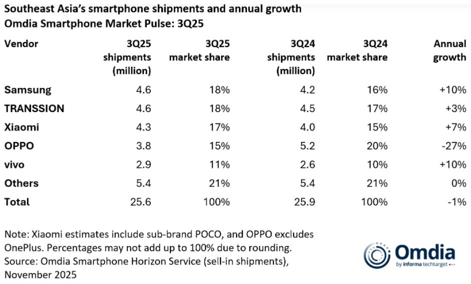 The Southeast Asia smartphone market saw a slight one percent decline in the third quarter of 2025, with total shipments reaching 25.6 million units. This marks the third consecutive quarter of year on year contraction, reflecting ongoing pressure in both premium and entry-level segments, according to the latest data from Omdia.
