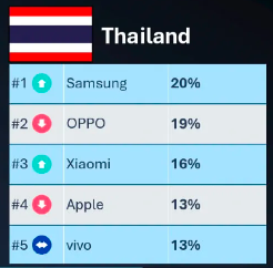 Thailand stands out in the region for its strong premium appetite, with Apple maintaining a top-five position despite focusing solely on high-end devices.