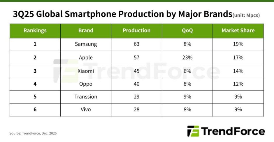 Samsung held its lead in global production with nearly 63 million units in the third quarter, an 8 percent increase quarter on quarter, giving it a 19 percent market share. Strong sales of the Galaxy A series and positive reception for its refreshed foldable models helped strengthen both volume and high-end shipments.
