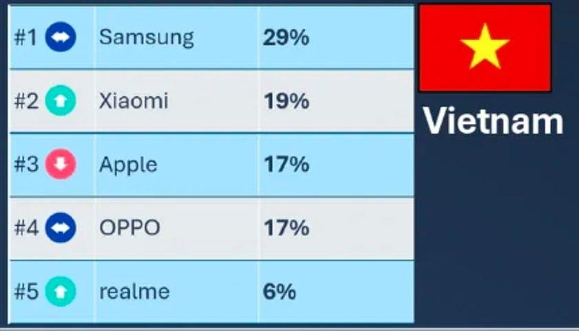 Vietnam’s smartphone market in Q3 2025 reflects strong consumer demand for mid-range 5G devices and sustained interest in premium upgrades. Samsung remains the top smartphone brand in the country with a commanding 29 percent share, supported by its broad Galaxy portfolio and strong nationwide distribution.