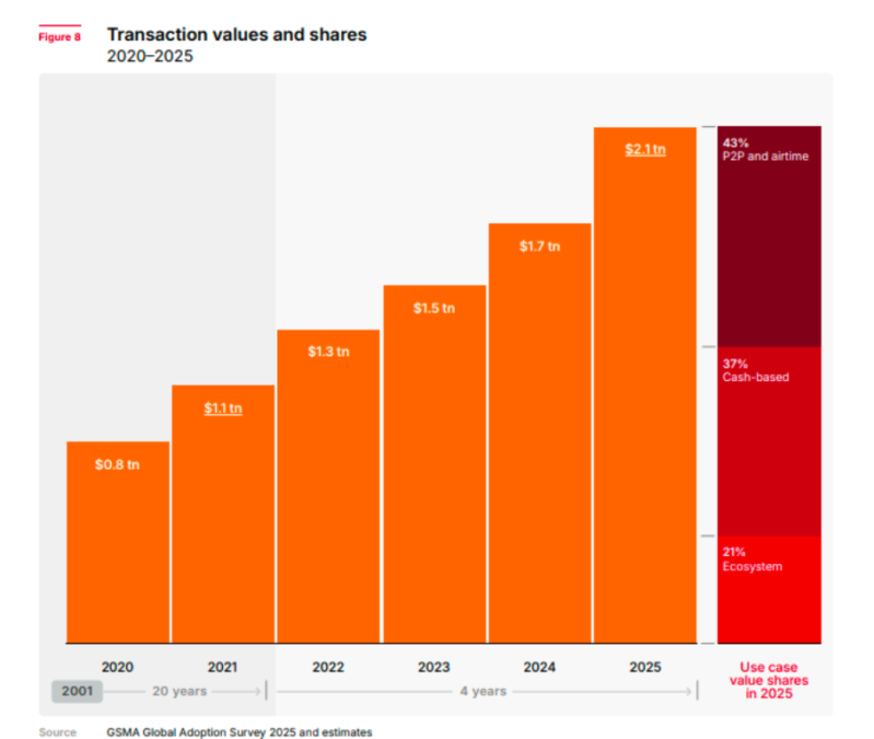 The size of the global mobile money industry – in terms of total transaction values – has surpassed $2 trillion and registered accounts reached 2.3 billion in 2025, according to the GSMA. This represents a 13 percent increase in accounts compared to the previous year, with an additional 268 million users joining the ecosystem – the largest annual growth.